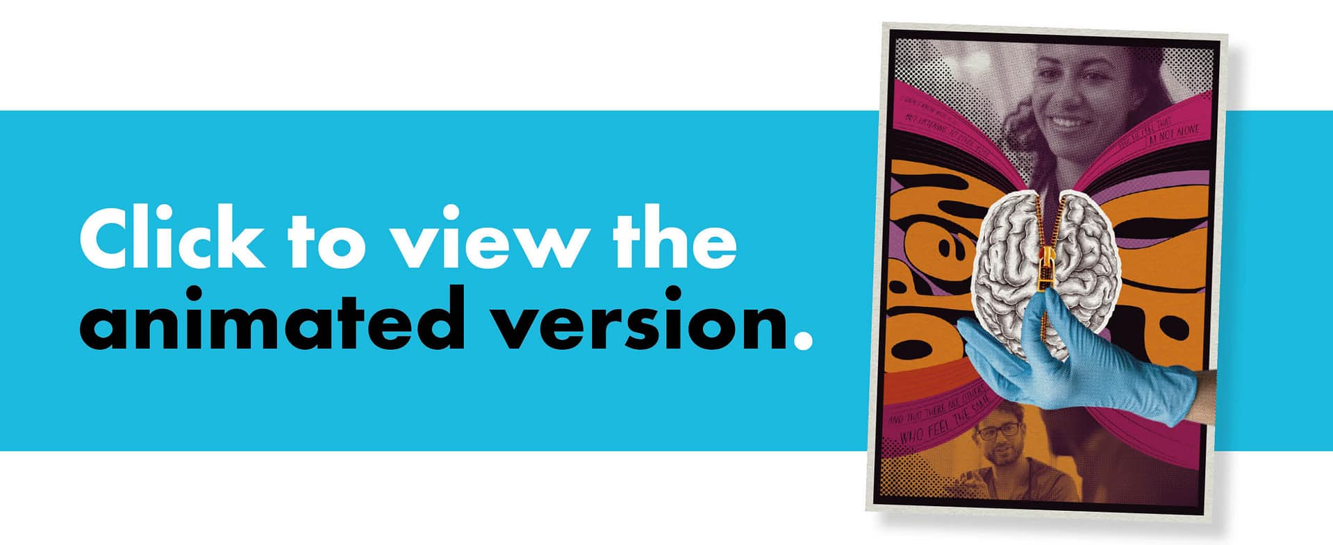 To play further with the thought of “opening your mind”, I leant into the surreal image of an unzipped brain and drew on 1970s poster art shapes, fonts, and colours for a psychedelic feeling. Keen to draw on actual lived experiences, we incorporated quotes from the “You Okay, Doc?” site, and finally added some lovely textures to tie the whole thing together.